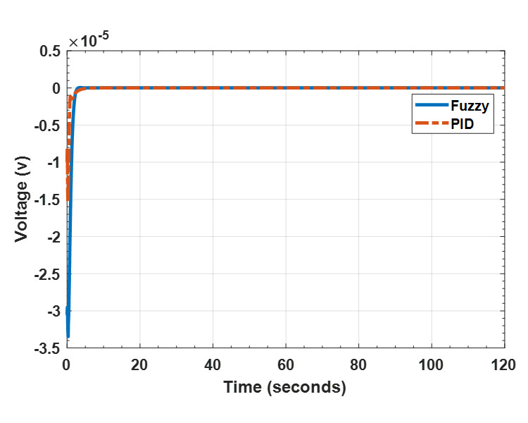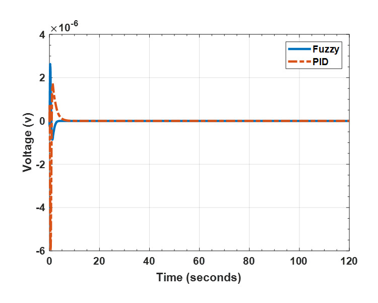 In this section, stabilization control of DRIP using cascade hybrid PID and hybrid Fuzzy-LQR controller has been analysed. Figure 9, Figure 10 and Figure 11 shows the stabilization results for the arm angle, lower pendulum angle and upper pendulum angle respectively. It can be seen that for the arm stabilization, the hybrid Fuzzy-LQR controller outperformed the hybrid PID-LQR in terms of the performance indices considered. This is the same for both upper and lower pendulums. However, the rise time is lower for the hybrid PID-LQR for both upper and lower pendulums. The performance indices considered are rise time, settling time, overshoot, undershoot and steady-state error.