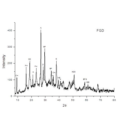 Figure 1.XRD Pattern of FGD waste (A = Quartz, B = Calcite, C = Chabazite, D = Portlandite, E = Sodium carbonate, F = Brucite , G = Ettringite and H = Hydrated hydroxide of calcium oxide and aluminum)
