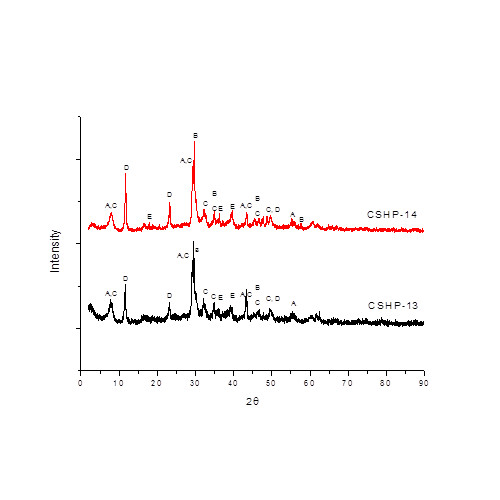 Figure 4.XRD Patterns of the CSHP products synthesized by using the fusion step at 600 °C (A = Tobermorite 9A- Ca5Si6(OH)2O16.4H2O, B = Al-tobermorite - Ca5Si5Al(OH)O17.5H2O, C = Hydrated magnesium aluminum hydroxide - MgAl(OH)14.H2O, D = Periclase - MgO, E = Hydrated calcium silicate Ca1.5SiO3.5.H2O, and F = Sodium calcium aluminosilicate - Na0.45Ca0.55Al1.55Si2.45O8)