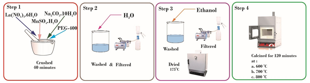 The LaMnO3 perovskite catalyst was synthesis via modified a simple solid-state reaction process [21], 35.81g of La(NO3)3.6H2O, 13.98g of MnSO4.H2O, 70.99g of Na2CO3.10H2O, and 3 mL 50% (vol) PEG-400 surfactant were mixed and grounded in a mortar for 40 min and keep at a constant temperature of 30oC for 60 min. Then the mixture was washed using distilled water to remove inorganic salts and then filtered. The solid obtained was then washed with anhydrous ethanol, filtered, and dried at 75oC for 3 hours. The precursor calcined at a predetermined temperature for 2 hours to obtain the LaMnO3 perovskite catalyst. The calcined temperature was varied from 600oC to 800oC to study the effect of calcined temperature on catalyst performance. The schematic of the preparation of LaMnO3 catalysts can be seen in Figure 1.