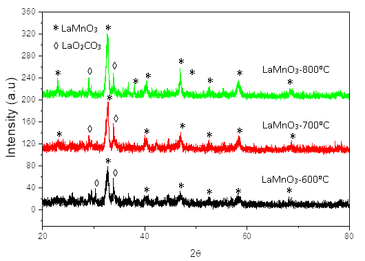 The XRD pattern of three LaMnO3 perovskite catalysts obtained at different calcined temperature is shown in Figure 2. As can be seen, the XRD pattern of the catalyst obtained at temperatures 600oC, 700oC, and 800oC shows a similar pattern. The XRD pattern of the LaMnO3 perovskite catalyst obtained at a calcined temperature of 800oC shows peak pattern at an angle of 2θ: 23.0397°; 32.7985°; 40.2931°; 46.9562°; 52.8982°; 58.3469°; and 68.8452°, which is identical with JCPDS File No. 50-0297. This peak pattern indicated that the catalyst is rhombodental LaMnO3 perovskite. The catalyst obtained at a calcined temperature of 600oC and 700oC shows similar characteristics. However, the peaks pattern's intensity is lower, indicating that the crystallinity of the catalyst obtained at a calcined temperature of 800oC is higher than obtained at a lower temperature. Besides the peaks pattern's of LaMnO3 perovskite, all of the catalyst show there is a peaks pattern is that indicate of LaO2CO3 existence. According to Wei et al. [21], the precursor La(NO3)3.6H2O and PEG-400 at temperature 75oC will form La2(CO3)3.8H2O with the increasing temperature the La2(CO3)3.8H2O was obliterated, and at 400oC, the monoclinic crystalline LaO2CO3 appeared. As the temperature increases up to 800oC, the LaO2CO3 and MnCO3 will form LaMnO3 perovskite.