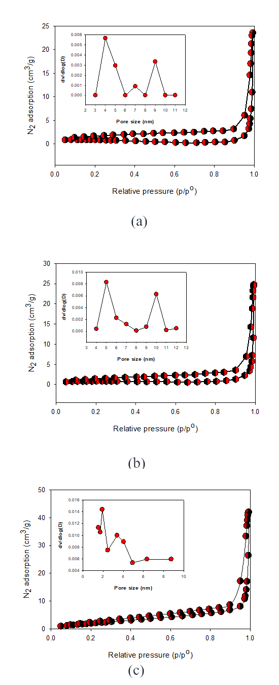 Figure 3.Figure 3. N2 adsorption-desorption isotherms and the inset pore size distribution of LaMnO3 perovskite catalysts: (a) LaMnO3-600 oC, (b) LaMnO3-700 oC, (c) LaMnO3-800 oC.