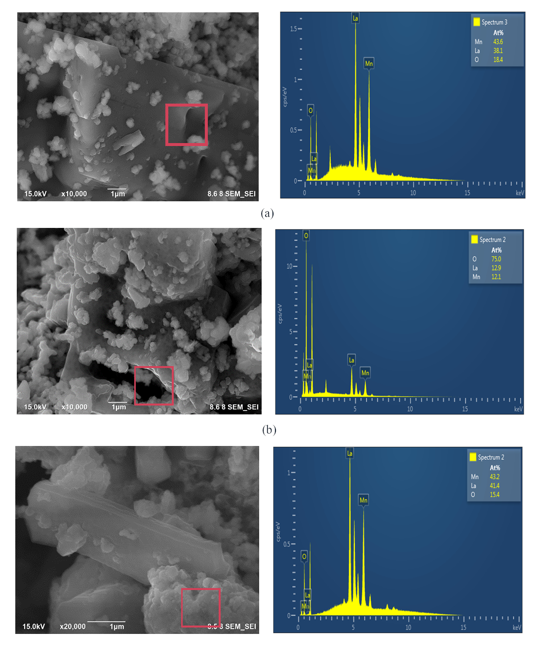 Figure 4.Figure 4. SEM and EDS spectrum (zone indicated by red squares) of LaMnO3 perovskite catalyst obtained at a calcined temperature of: (a) 600oC, (b) 700oC, and (c) 800oC