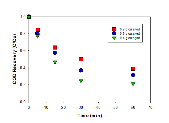 Figure 6.Figure 6. COD removal on various catalyst loading. Condition of reaction: Initial COD of POMSE = 1700.7 mg/L, PMS = 2 g/L, and T = 30 oC