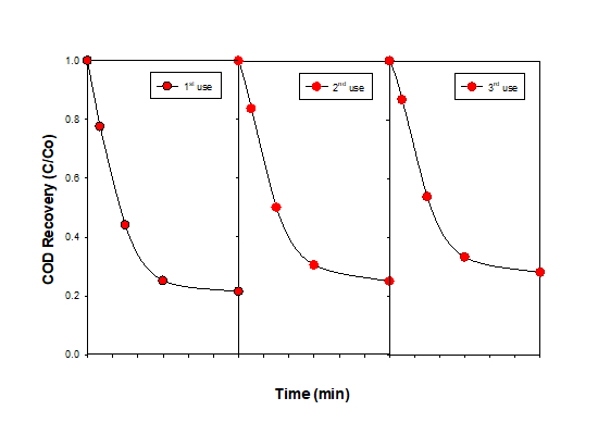 The stability of the catalyst will largely determine whether the catalyst can be used in practical application. The stable catalyst can be recycled without a significant performance loss will reduce the catalyst's cost. In this reusability test of the catalyst, the fixed variables: initial COD of POMSE = 1700.7 mg/L, catalyst loading of 0.4g/L, PMS concentration of 2g/L, and the temperature of 30oC were used. The results of the catalyst reusability test can be seen in Figure 10.