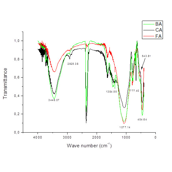 The shape of the curves observed in Figure 14, Figure 15 and Figure 16 shows that the particle size distribution follows a normal distribution, thus the average particle diameter of BA, CA and FA samples can be considered to be close to D50, and therefore are around 84.600 μm, 49.348 μm and 8.167 μm, respectively. The D3.2 and D4.3 diameter values, calculated by the equipment and based on the average surface area of the particles and on the average volume of the particles (very important to design particles retention equipment), respectively, are shown in Table 10. The size of particles is in accordance with the scanning electron micrographs results (Figure 8) and thus decreased as follows: BA>CA>FA. D10 values confirm that the smallest particles are in FA sample, as before discussed.