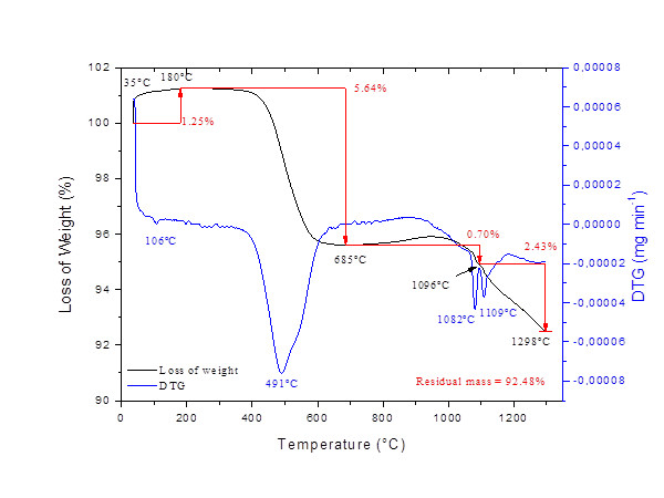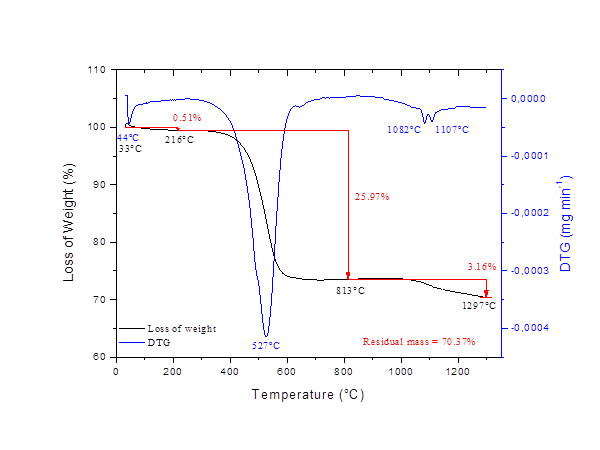 Light elements as H, Li, Be, B, C, N e O were not identified by the X-ray fluorescence equipment used in this study but their presence can be detected by using other characterization techniques such as loss on ignition and total carbon content (Table 1), infrared absorption spectroscopy (Figure 3) and thermal analysis (Figure 4), which will be discussed later.