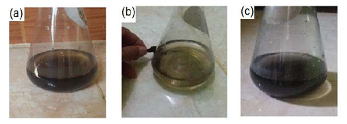 Figure 1.The as-synthesized black precipitate disperse well in water (a) the precipitate interacts with external magnetic field (b) re-dispersible powder in the water after the magnetic field is removed (c)