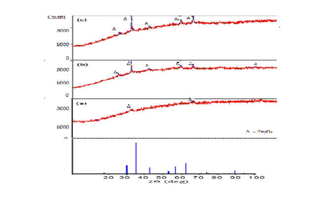 Figure 4.Diffractogram of the as-synthesized samples at temperatures of 210 ° C 12 hours, FeCl3 concentrations of (a) 0.05 M, (b) 0.10 M and (c) 0.15 M