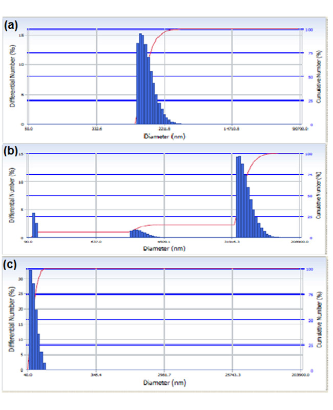 The particle size distribution was analyzed by PSA (Beckman Coulter) at 25oC and the viscosity of 0.8878 cp in water for 30 minutes.