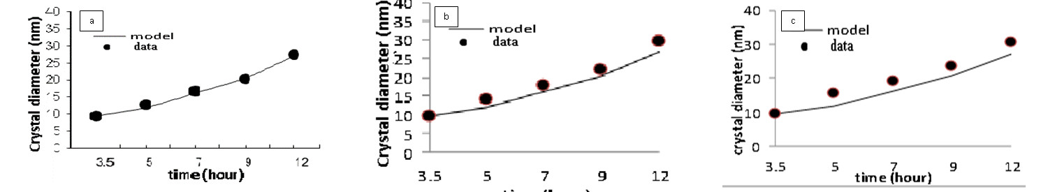 Figure 7.Diameter of magnetite crystal particles from experiment and model at reactant concentration of 0.05 M (a); 0.1 M (b); 0.15 M (c)