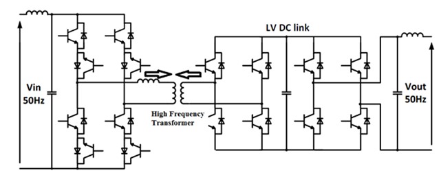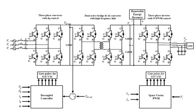 There are three main conversion stages in the SST. These are : i) AC-DC conversion stage (Rectifier); ii) DC-DC conversion stage; and DC-AC conversion stage (Inverter) [16,17].
