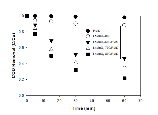 The POMSE degradation was performed in a 1000 mL glass reactor equipped with a magnetic stirrer, electric heater, and temperature controller. The performance of the LaMnO3 perovskite catalyst obtained at a calcined temperature of 600, 700, and 800oC was compared to determine the best-calcined temperature. The operating conditions were volume POMSE of 1000mL, stirrer speed of 400 RPM, catalyst loading of 0.4g/L, PMS concentration of 2g/L, and temperature of 25oC for 60 min. For every predetermined time, 5mL of the sample was taken out for COD analysis. COD reactor Hach DRB200, USA, have determined COD removal. For selected POMSE samples, an Analytic Jena AG N6-508/L, Germany was used to determine Total Organic Carbon, TOC. As a comparison, PMS performance alone and LaMnO3 perovskite catalyst in the absence of PMS were also tested under the same conditions. The best catalyst was used to study the effect of catalyst loading, PMS Loading, and temperature on POMSE degradation.