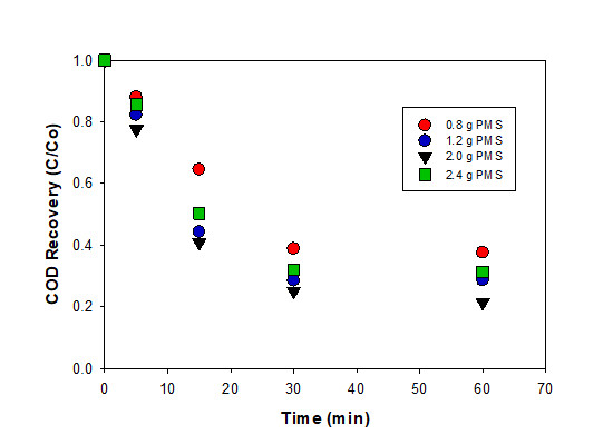 Thus, for each catalyst loading used, there is a specific PMS concentration, which will result in the optimum degradation efficiency of organic content in POMSE. The optimum COD reduction efficiency of 78.5% was obtained at a 0.4g/L catalyst loading and 2g/L PMS concentration.