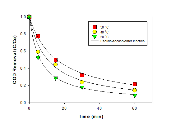The plot of the kinetic equation of 1/COD versus time was linear so that the kinetics followed the pseudo-second-order reaction. Table 2 shows the value of the reaction rate constant, the kinetic equation, and the R2 coefficient for every temperature.