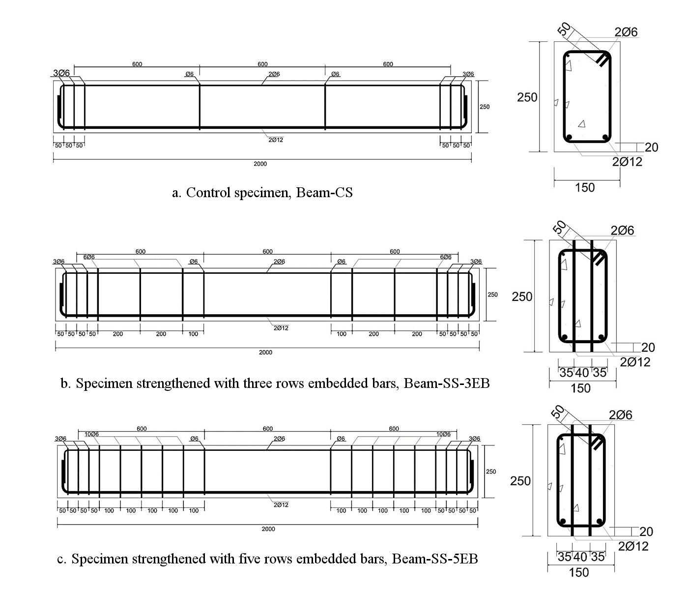 Figure 1.Figure 1. Reinforcement details for specimens, units in mm: (a) a. Control specimen, Beam-CS, (b) a. Specimen strengthened with three rows embedded bars, Beam-SS-3EB, (c) Specimen strengthened with five rows embedded bars, Beam-SS-5EB