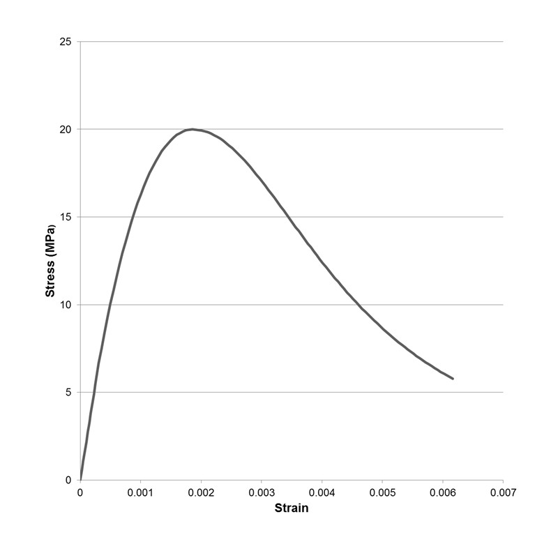 In this study, stress-strain behaviour for concrete under compression is defined in three different regions, namely elastic, hardening, and softening. A concrete response in linear-elastic is considered between 30-40% of its ultimate compressive strength. When the compression load is increased, the hardening region of the stress-strain curve develops where the concrete stress increases until it reaches maximum compressive strength and the tangential stiffness decreases to zero. After the ultimate compressive stress is reached, the softening region of the concrete in compression starts. This is the part of the stress-strain curve where the strength of concrete degrades rapidly and concrete softens whilst losing its load carrying capacity.