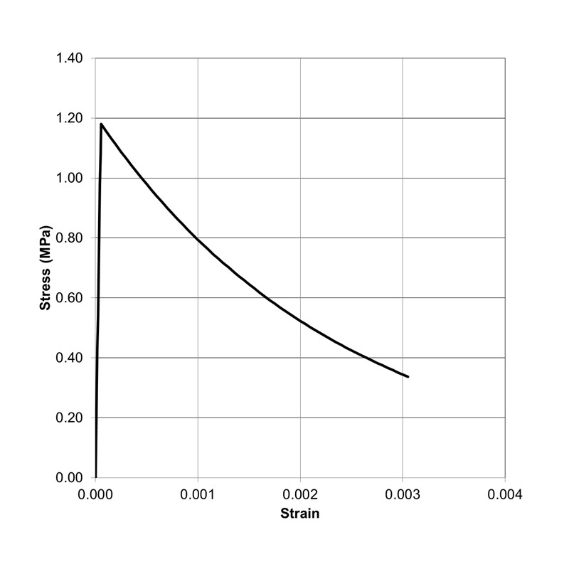 The stress-strain curve of concrete under tension load is also modelled in a similar manner to the compressive stress-strain curve. In this case, the stress-strain curve for concrete under tension shows two distinct regions, namely the elastic region and the softening region as shown in Figure 3.