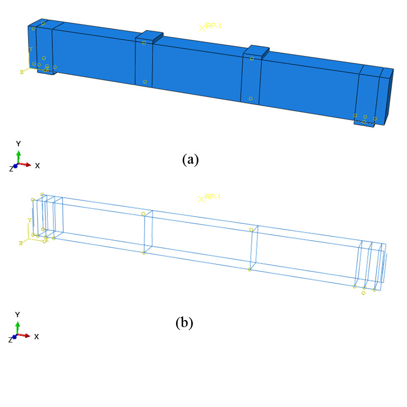 Three-dimensional nonlinear finite element model was developed with respect to the reference reinforced concrete beam model shown in Figure 1. Tie constraints were employed to connect the degrees of freedom of the support and loading plates to the corresponding degrees of freedom of reinforced concrete beam element. The degrees of freedom of the truss elements simulating the embedded reinforcing bars and the degrees of freedom of the brick elements of the surrounding concrete was tied using embedded region constraint. A constant compressive force was imposed at a reference point and tied to the loading plate that connected to the beam element in the form of a prescribing displacement history. FE model developed in this study can be seen in Figure 5.