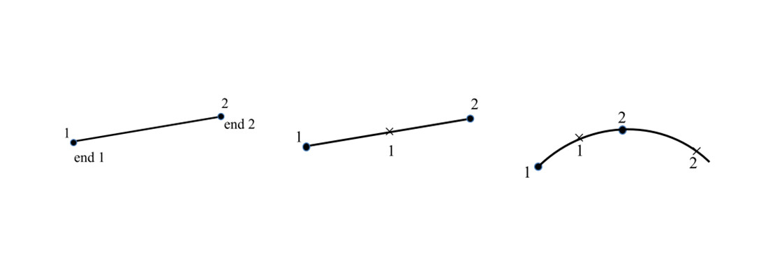 Element types available in ABAQUS and can be used to model reinforcement steel bars, namely truss elements (T3D2), linear beam elements (B31) and quadratic beam elements (B32). The two-node T3D2 element allows constant axial stress along its length and has no stiffness when subjected to loading perpendicular to the axis of the element. On the other hand, beam elements B31 and B32 are Timoshenko beam elements resulting in axial, shear and flexural stiffness. B32 uses quadratic interpolation functions for position and displacement whilst B31 is a 3D linear Timoshenko beam element. The three elements mentioned, their associated notes and geometry are shown in Figure 7.