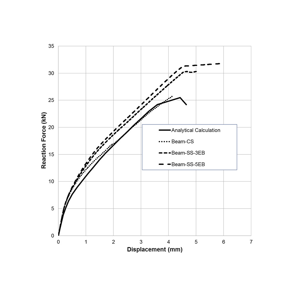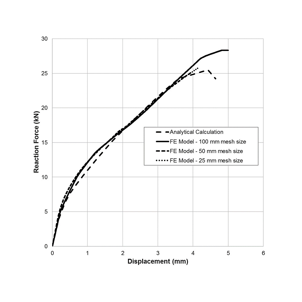 The load ratio and diffrence of FE analysis to analytical calculation using a 25 mm element size was 1.01 and 1.05%, while ratios and diffrences using 50 mm and 100 mm element size were 0.92 and 8.19% and 1.11 and 11.18%, respectively. Table 2 shows that the FE analysis conducted on the 25 mm element size provided a very close agreement between the analytical and the numerical response of the peak load (Pmax). Based on these observations, further validation is conducted based on the analysis using 25 mm element size.