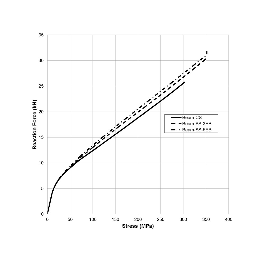 Figure 9 depicts the load-displacement responses of the strengthened specimen, Beam-SS-3EB and Beam-SS-5EB, compared with the control specimen Beam-CS. Overall, the maximum reaction force for both strengthened beams were enhanced with the increase of number of embedded bars used in the strengthening system. Table 3 shows that the maximum reaction force for Beam-SS-3EB and Beam-SS-5EB were 30.30 kN and 31.77 kN, respectively, represents an increase of 17.67% and 23.29% compared to that of the Beam-CS.
